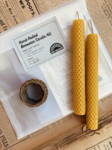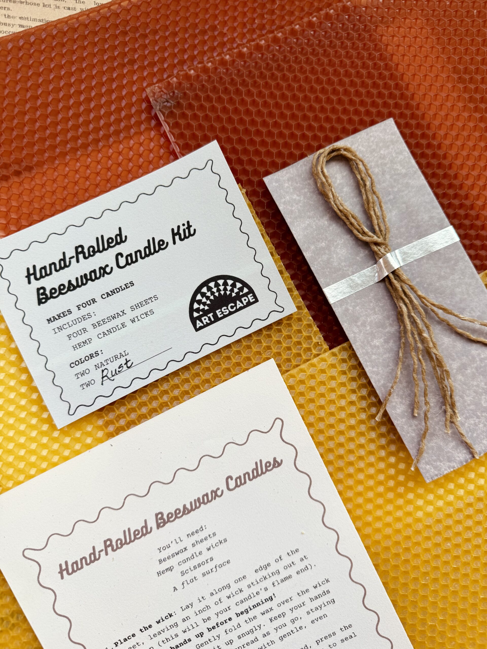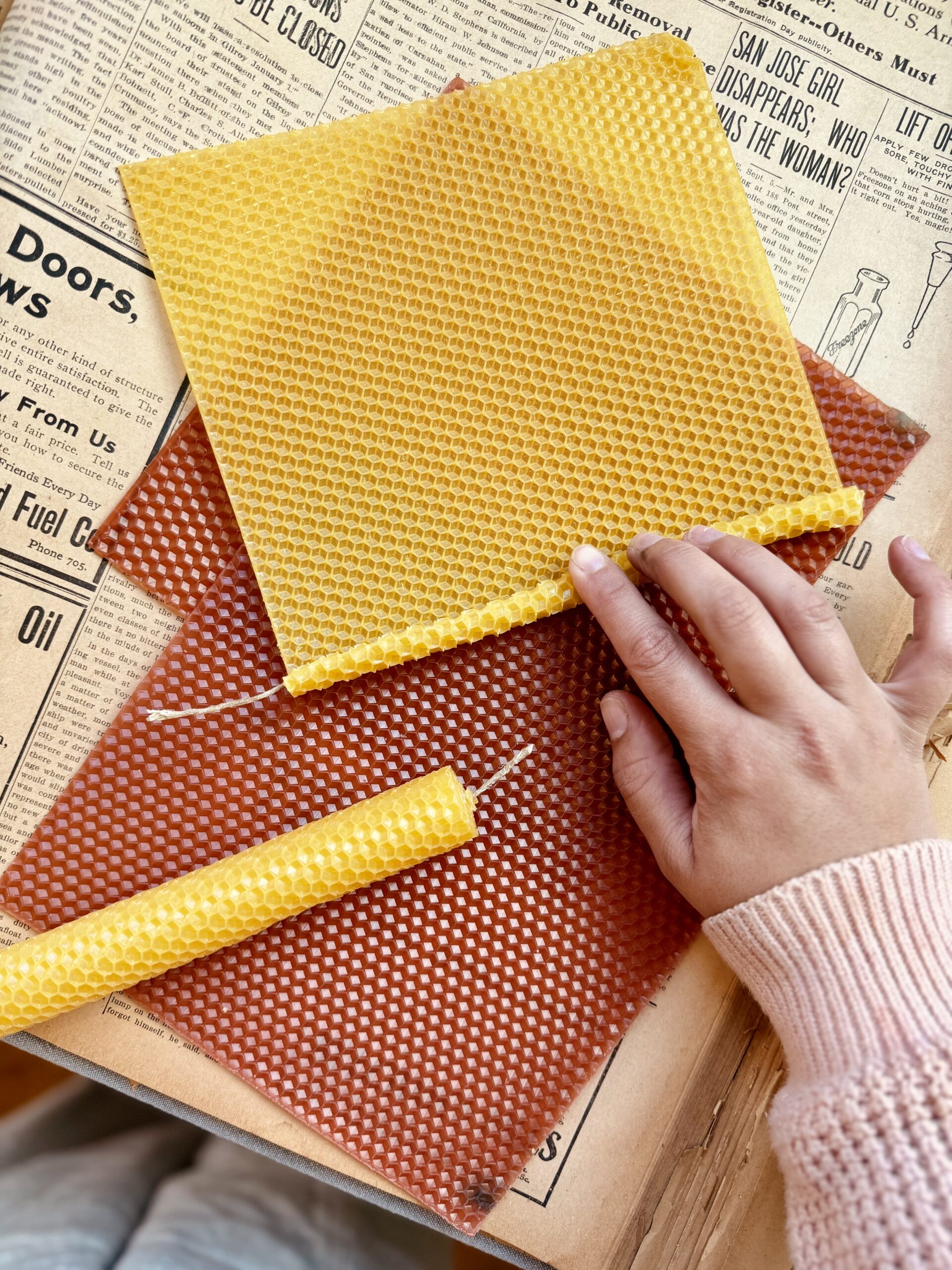 Your kit comes with two beeswax sheets in hues of honey and two sheets in varying complementary colors, making each set unique. Upon pickup, you can choose your color combination.